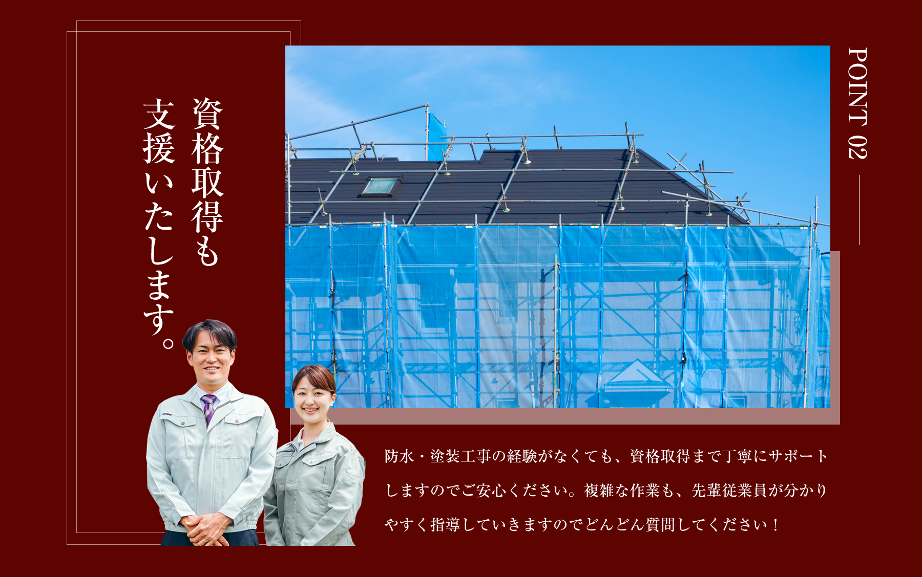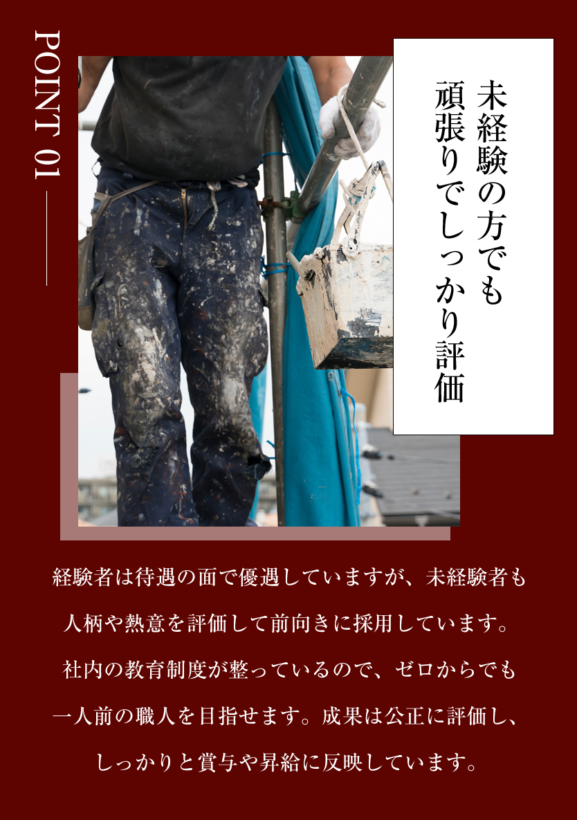 戸建住宅、マンション、ビルの外壁や屋根に色を付けたり、長持ちするためのコーティングをするお仕事です。仕事をしながら、一生モノの技能が取得ができるので長期にわたって稼ぐことが出来ます!未経験の方は簡単なことから少しずつお任せいたしますので、ご安心ください。まずは先輩社員に同行し、材料資材や工具の運搬等の補助業務から始めていただきます。