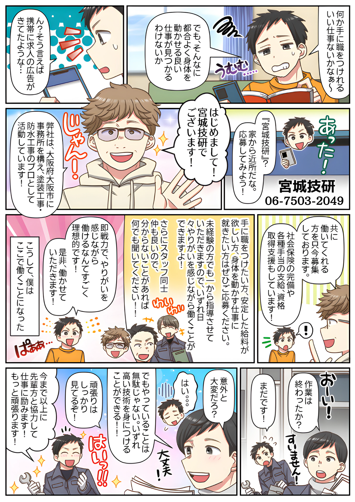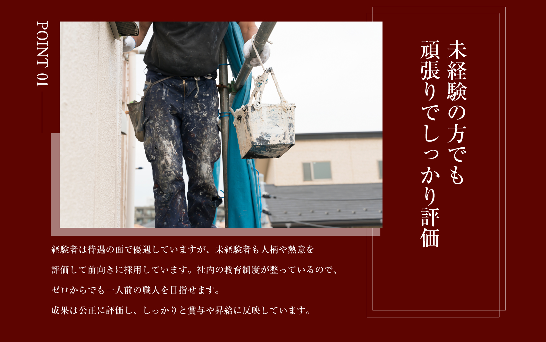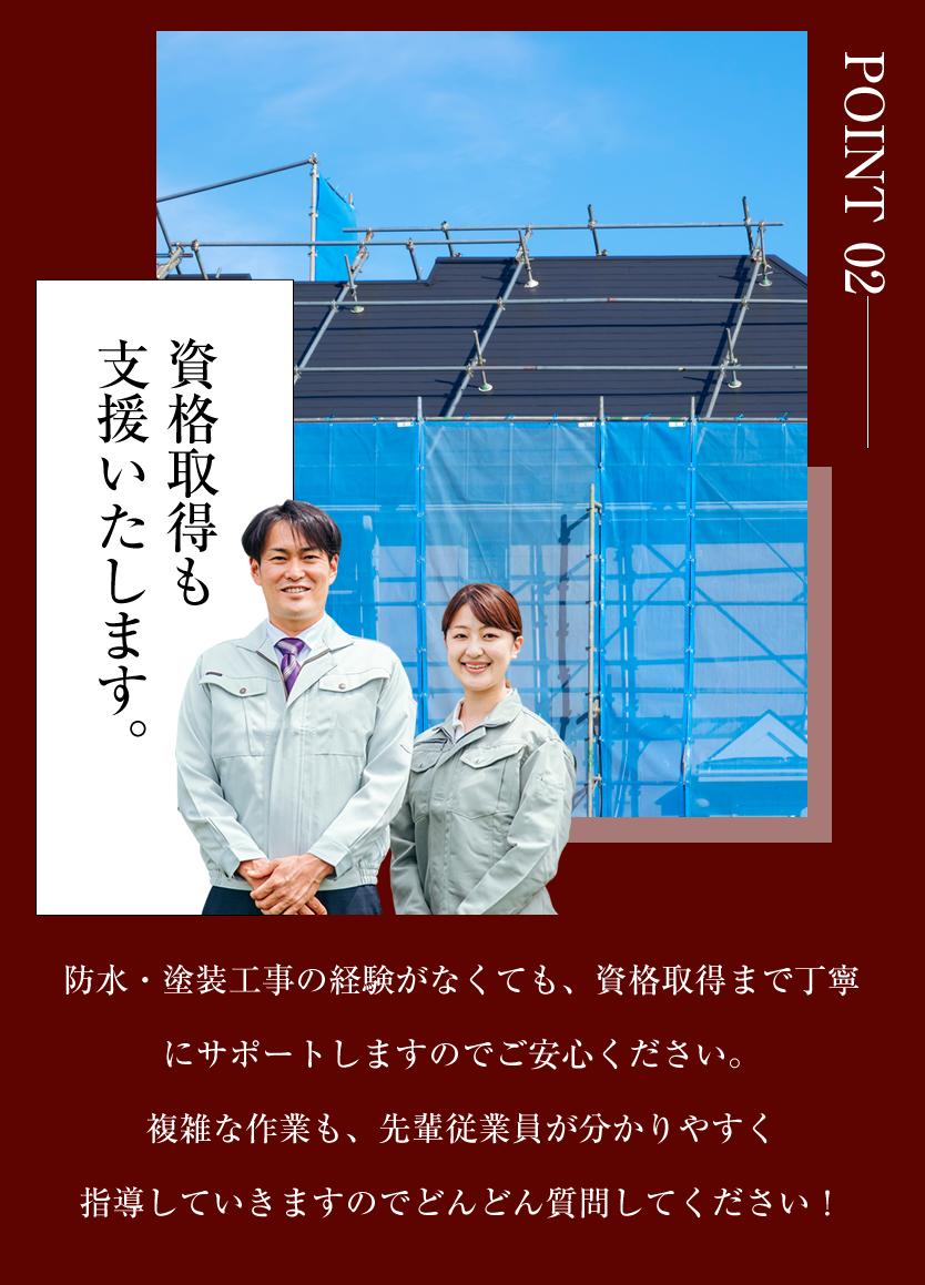 戸建住宅、マンション、ビルの外壁や屋根に色を付けたり、長持ちするためのコーティングをするお仕事です。仕事をしながら、一生モノの技能が取得ができるので長期にわたって稼ぐことが出来ます!未経験の方は簡単なことから少しずつお任せいたしますので、ご安心ください。まずは先輩社員に同行し、材料資材や工具の運搬等の補助業務から始めていただきます。