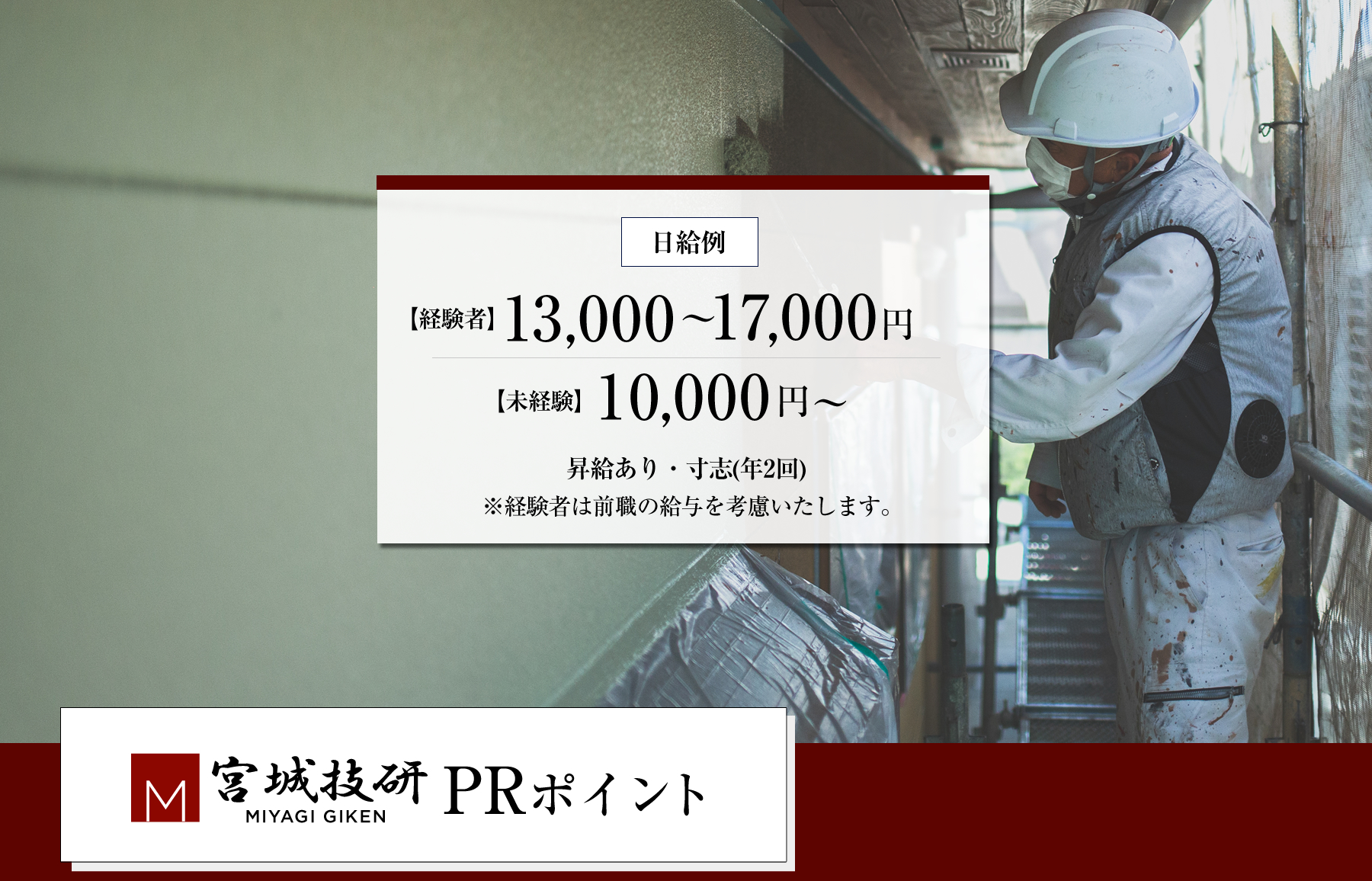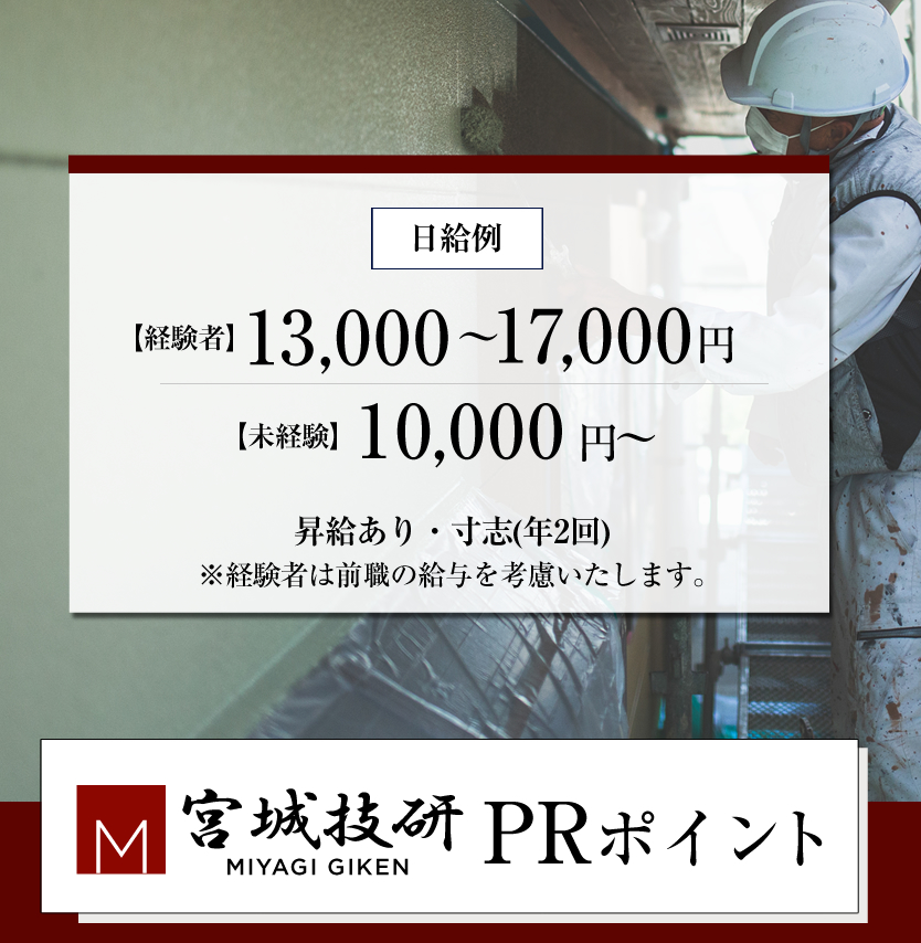 | 給与 | 経験者13000円~17000円(日給) 未経験10000円(日給) |